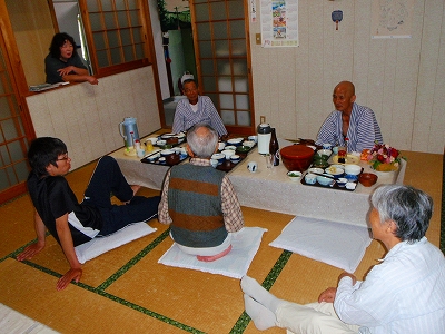 下の集合写真は左側から ぎょろっとした目の島根県沖ノ島からきた逆打ちお坊さん(ヤクザではない) 再会した奥田さん 夫婦で遍路7回目のお二人 山梨から来た田中君29歳