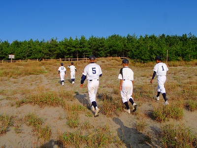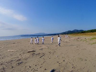 それで、試合前のウォーミングアップで、浜をランニングすることになったらしい。