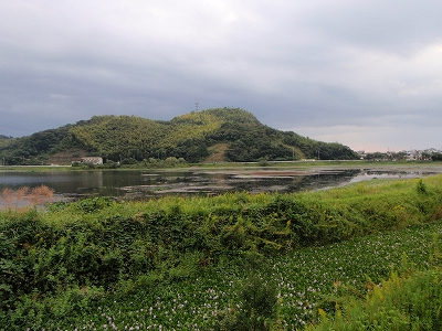 手前が石土池で、その向こうに見える小山にお寺がある。