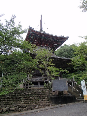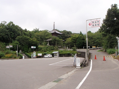 山門を越え、少し歩くと駐車場の先に塔が見える